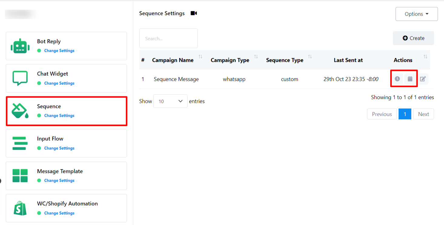 Create a New Sequence Message Campaign: Also, there is an option to create new sequence from here. To create a new sequence just click on the `Create` button.